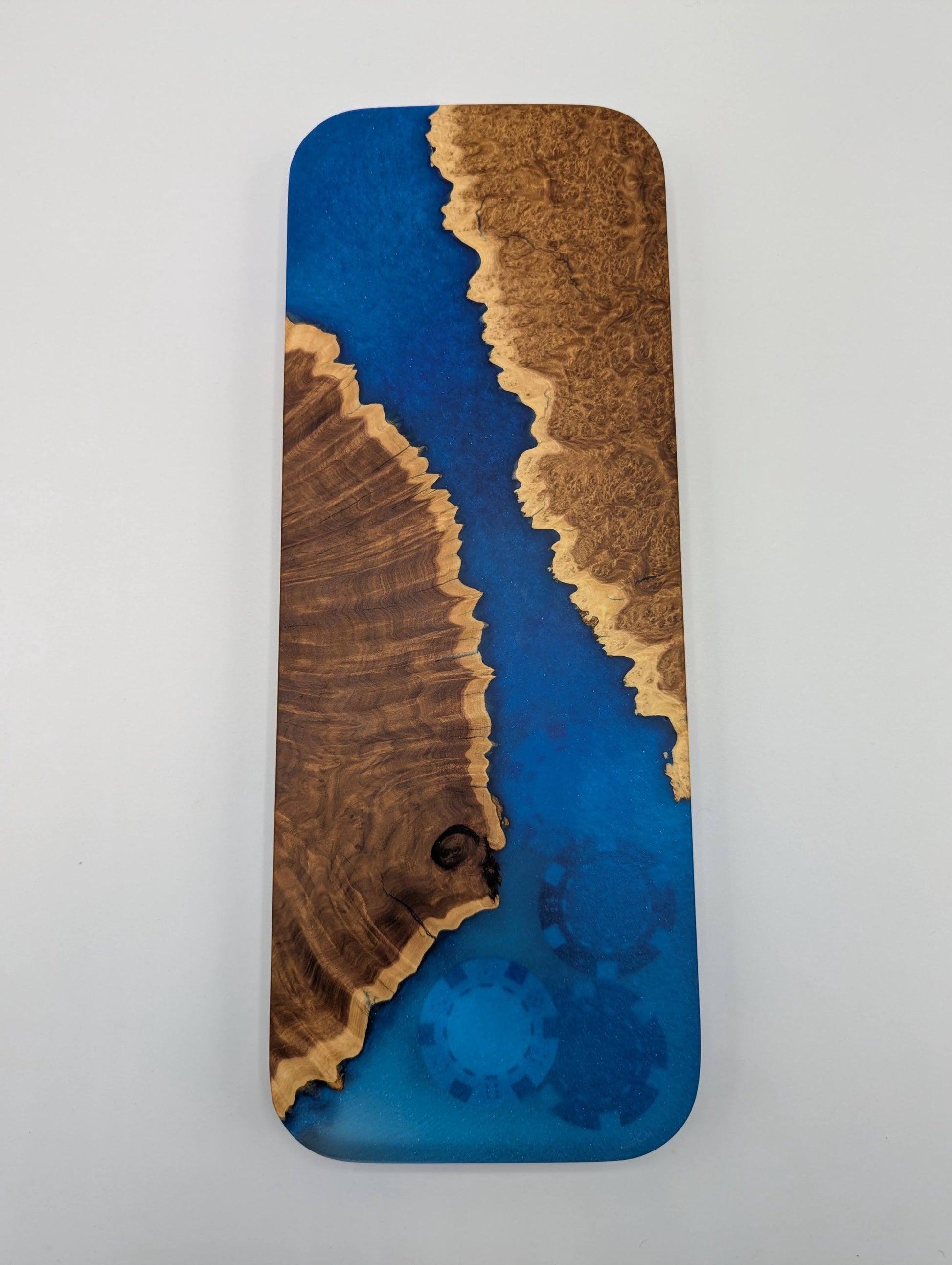 This board is made with Australian Brown Mallee burl and blue epoxy resin. Embedded in the resin a variety of poker chips. It measures 4”x12” and the holes are drilled to 1/8”. Machined metal pegs are included, we offer stainless steel, brass, copper, and blackened steel. Please send us a note if you have a preference for the three colors that come with the board.