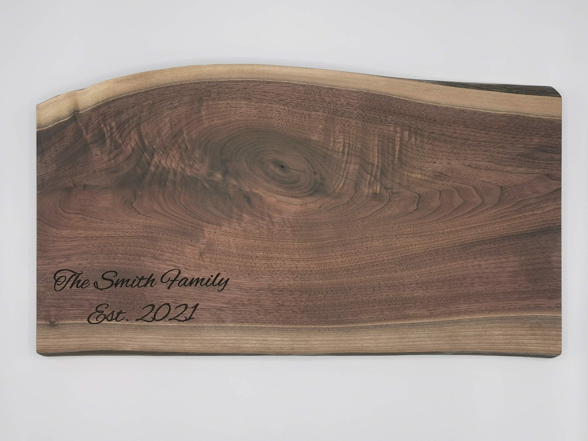 Each of these beautiful live edge walnut boards can be laser engraved with a family name or phrase! These charcuterie boards are made from premium grade, hand selected Canadian black walnut. We order all our wood direct from the sawmill with strict specifications for grade and color. Your board will be selected from the same batch that the sample board shown came from. Each of these boards will measure 18" long, between 9-11" wide, and 1" thick. There will be variations to the grain and coloring from what is shown, each piece of wood is unique. All of our boards are food safe and can be used for food prep or serving. We also offer the same wax used for finishing as an add on for upkeep and maintenance.